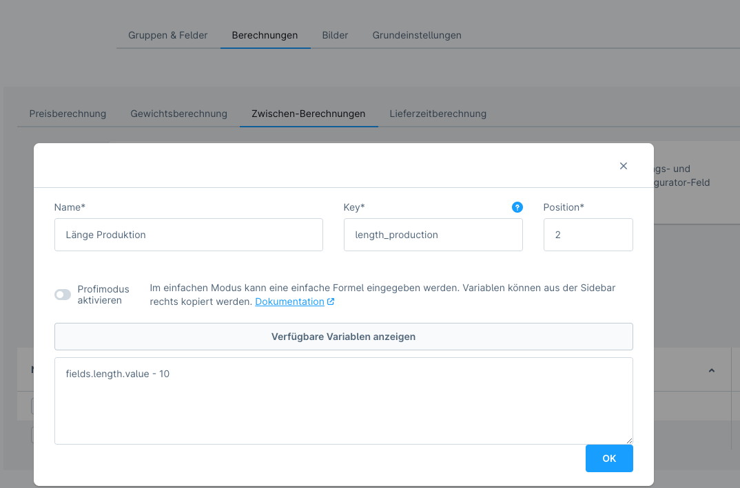 <figure><img src="https://665968178-files.gitbook.io/~/files/v0/b/gitbook-x-prod.appspot.com/o/spaces%2FumO1dT2DDgq6BDHjh0sb%2Fuploads%2FSz3EFlsPqDSo1A4EwXKm%2Fimage.png?alt=media&#x26;token=5357a517-6a38-4b8f-9ab2-8f5184c5b0e9" alt=""><figcaption><p>Zwischenberechnung in einer Konfiguration, die Länge wird in einer Zwischenberechnung um 10 reduziert</p></figcaption></figure>